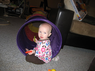 Alison has been fussy from stubborn teeth that seem to cause so much trouble but have not yet made any appearances! We took her to the pediatrician a while back because we thought something else might be wrong, but the doc just confirmed that she is getting teeth. So, we have been trying to do fun things to help the process not seem so frustrating. Alison crawls through the tunnel with ease. She even crawls through with toys and never leaves them inside. Maybe she likes to hold on to them, or maybe she wants to keep the path clear? If only I knew what she was thinking.